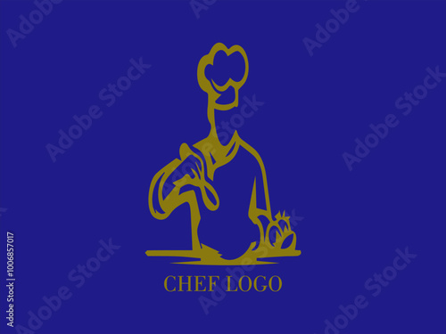 © Arnis, Fototapeta premium Cook, chef preparing a dish, logo design with blue background and yellow gold color image, restaurant and catering, design and vector illustration
