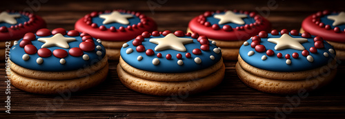 © Mr. B, Fototapeta premium Cookies with red, white, and blue icing on a wooden surface.