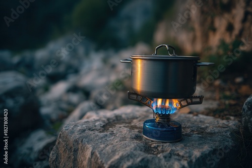 © Asier, Naklejka premium Cooking pot heating up on a gas burner on a rock during an outdoor adventure
