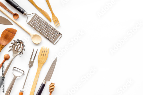 Fototapeta premium Cookware as instruments for cooking on white background top view copy space