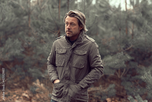 Obraz premium Cool blonde man in green coat walks in a forest.