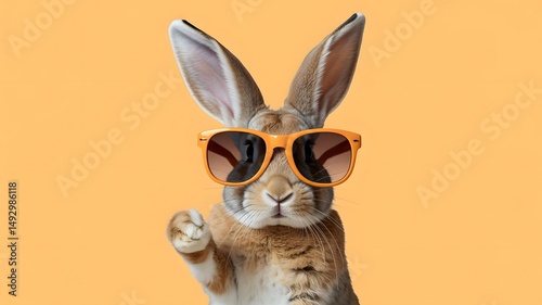© Ismaile, Obraz premium Cool bunny rabbit wearing sunglasses waving paw