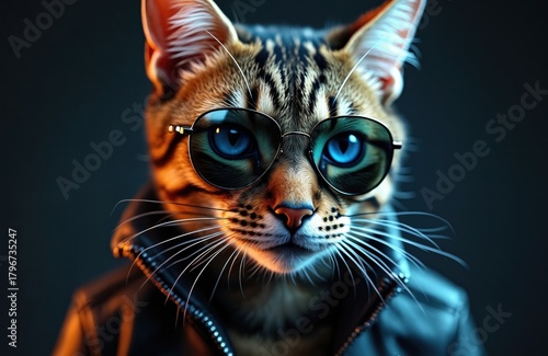 © Vadym, Obraz premium Cool cat wearing sunglasses and leather jacket. It has bright blue eyes and a serious expression. This feline looks like a rockstar or biker.