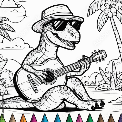 Fototapeta premium Cool dinosaur playing guitar in sunglasses illustration for children's coloring book, black and white style