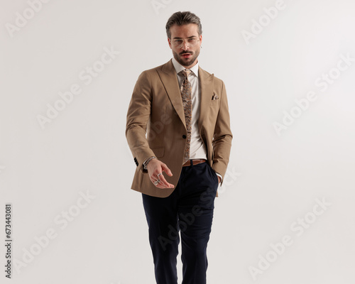 Fototapeta premium cool fashion man with glasses walking with hands in pockets