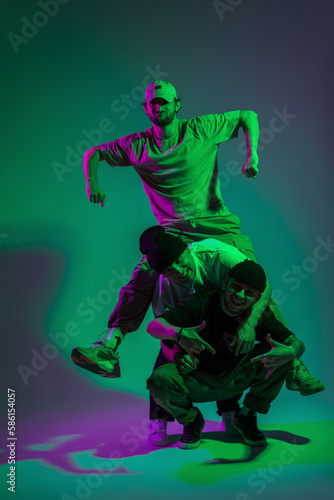© alones, Fototapeta premium Cool happy funny team of dancers in fashion clothes posing in a creative studio with cyan and magenta color