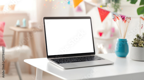© chekart, Fototapeta premium Cool laptop mockup in a stylish party room. An open laptop with an empty white screen stands on a white table in a room with a potted plant. The room has a cozy and welcoming atmosphere