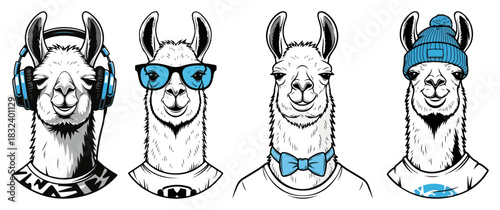 © Cristiano, Fototapeta premium Cool Llama Character Set. Hipster Alpaca Portraits with Headphones Sunglasses and Beanie. Vector Illustrations.