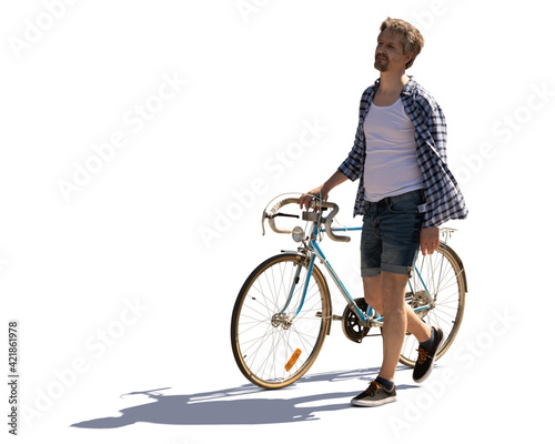 © Martin, Obraz premium Cool man walking with a bike on a summer day isolated on white background