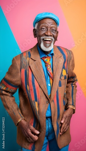 © Antonio Giordano, Fototapeta premium Cool senior african man with fashionable outfit portrait - Funny old male person with cool and playful attitude on colorful background