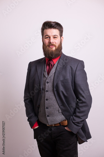 Fototapeta premium Cool young bearded man in grey business suit looking at the camera over white background