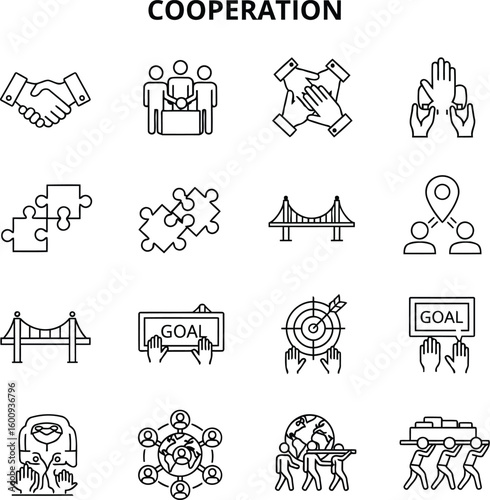 © shine, Naklejka premium “Cooperation & Teamwork Icons – Editable Outline Symbols for Goals, Unity & Collaboration”