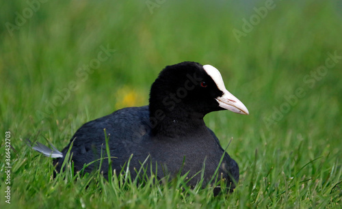 Fototapeta premium Coot relaxing on the grassy bank of a lake
