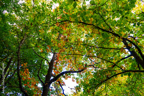 Fototapeta premium Copas das árvores no outono, bela paleta de cores outonais, castanhos, verdes, amarelos, laranjas