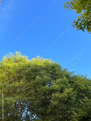 © NURIA, Obraz premium Copas de los árboles con follaje verde sobre cielo azul.