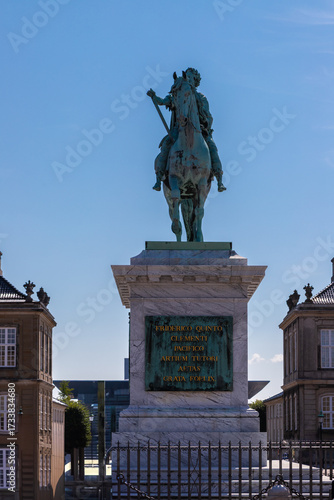 © KimWillems, Obraz premium Copenhagen, Denmark 07-20-2025 The Amalienborg Square in the center of Copenhagen which is being surrounded by the beautiful buildings of the Amalienborg Palace and in the centre the Equestrian statue