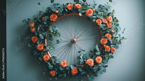 © mochalfin, Obraz premium Copper bicycle wheel adorned with peach roses and eucalyptus leaves, wall decor.