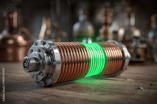 © BYAI, Obraz premium Copper coil with glowing green light sits on a wooden surface surrounded by glass bottles and metal equipment in a workshop
