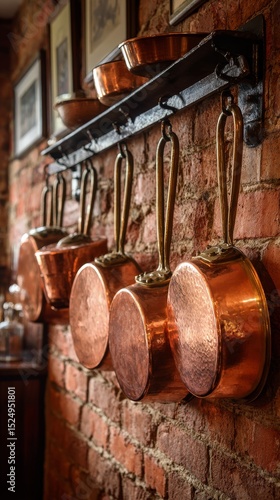 © olegganko, Naklejka premium Copper Cookware Mounted on a Brick Wall in a Rustic Kitchen Setting.