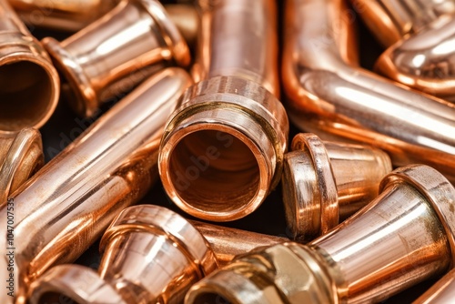 Naklejka premium Copper Pipes Construction for Plumbing Work with Metal Fittings on Water...