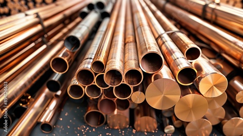 Naklejka premium Copper Pipes in Warehouse. Various sizes of copper pipes stacked and stored in a warehouse, illustrating the variety and organization of industrial materials.