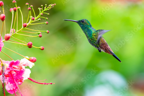 Fototapeta premium Copper-rumped hummingbird feeding on Pride of Barbados flowers in a garden....