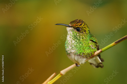 Fototapeta premium Coppery-headed Emerald - Elvira cupreiceps small hummingbird endemic to Costa Rica, bird feeds on nectar and small invertebrates, Pacific slope of Guanacaste and Tilarán Cordilleras
