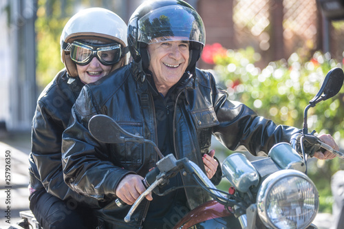 © alex.pin, Fototapeta premium Coppia di anziani vanno in giro sulla loro Motocicletta d'epoca