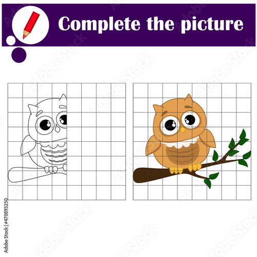 © Dreambook, Obraz premium Copy the grid game, complete the educational game for kids. Printable kids activity sheet with cute owl. Learning to draw symmetry