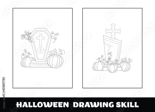 Fototapeta premium Copy the picture kids game and coloring page. Halloween education drawing skill game for preschool children.