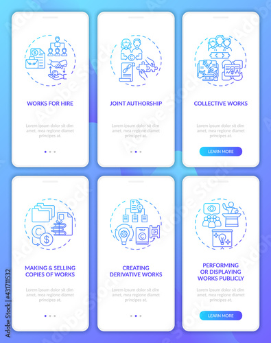 Fototapeta premium Copyright law protection onboarding mobile app page screen with concepts set. Selling works copies walkthrough 3 steps graphic instructions. UI, UX, GUI vector template with linear color illustrations