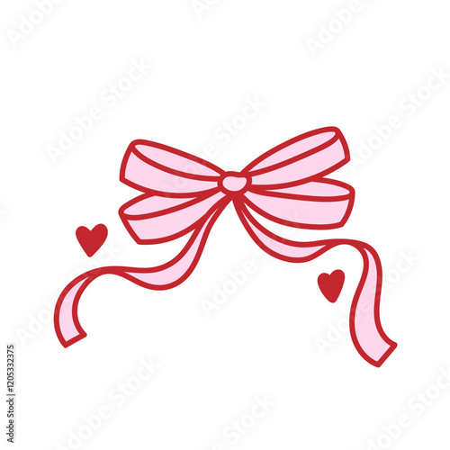 © viairevi, Naklejka premium Coquette pink bow of ribbon with red cute hearts. Beautiful holiday decorative element, festive gift decor. Vector clip art