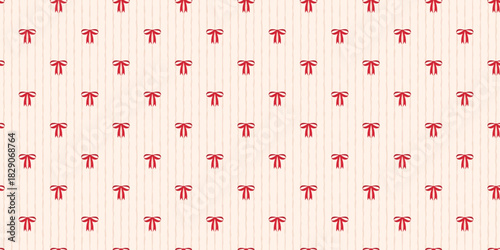 © accogliente, Naklejka premium Coquette seamless pattern red bow with ribbons on striped beige backdrop. Soft wrapping paper background for birthday, holiday and Christmas. Cute repeat wallpaper texture. Vector illustration