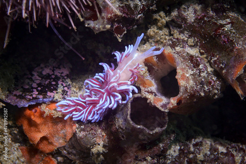 © MWolf Images, Fototapeta premium Coral nudibranch underwater (Phyllodesmium horridum) moving on the reef. Orange to pink body with a white stripe along its back. Curved cerata with an iridescent white stripe and purple coloration.