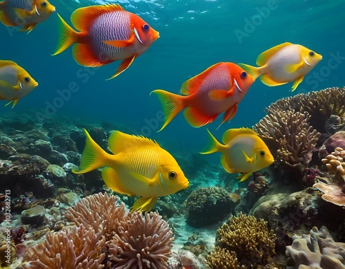 Fototapeta premium coral reef and colorful fish group under water pond lake river and sea