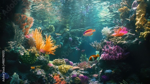Fototapeta premium Coral reef biodiversity with different marine species interacting, symbolizing ecological balance.