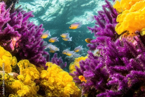 Naklejka premium Coral reef close-up: purple, yellow coral, tiny fish, sharp focus
