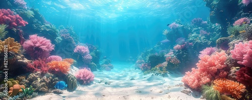 © NeeArtwork, Naklejka premium Coral Reef during a dive flat design front view underwater adventure theme 3D render Monochromatic Color Scheme