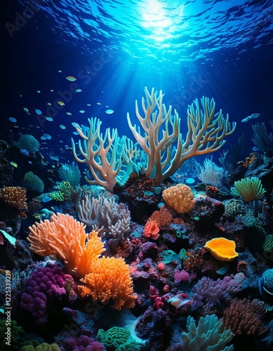 Fototapeta premium coral reef filled with luminous sea creatures.-