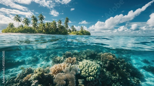 © Ti Studio, Naklejka premium Coral reef forming the base of a tropical island, with crystal-clear waters and vibrant marine life
