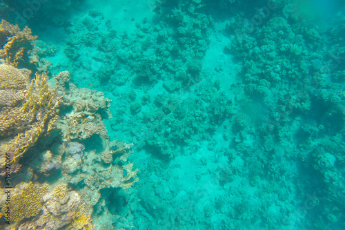 Fototapeta premium Coral reef in azure sea water at the bottom.