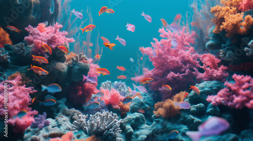 Fototapeta premium Coral reef in blue sea, teeming with colorful fish and swaying seaweed under...