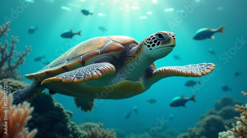 Fototapeta premium coral reef in the sea with turtle and multi color fishes.