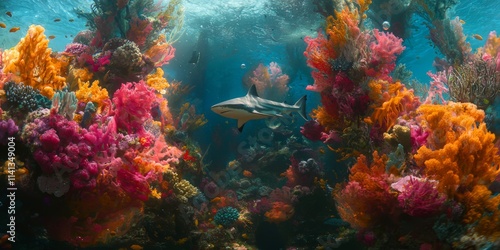 Fototapeta premium Coral Reef Shark Vibrant Underwater Scene