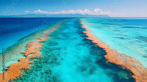 © budi, Obraz premium Coral reef stretches between dark turquoise waters beneath a clear blue skydistant mountains line horizon