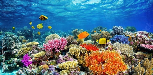© Irfanan, Fototapeta premium Coral Reef Thrives with Fish, Colorful Ecosystem Biodiversity