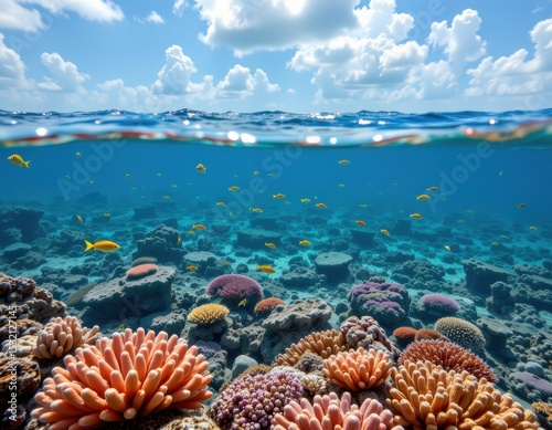 © Thi, Fototapeta premium coral reefs near coastal cities damaged by air pollution contributing to ocean acidification and warming, threatening marine biodiversity.