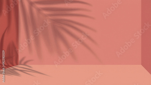 © Sabbir Media, Fototapeta premium Coral studio with overlapping palm leaf shadows, soft lighting