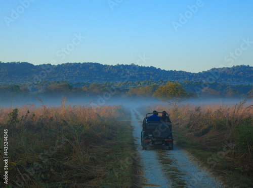© Sandipan, Fototapeta premium Corbett National Park, India - December 2016 : Wildlife safari in the grassland of Corbett National Park in the winter morning