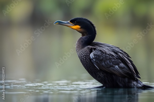 © Shabana, Obraz premium Cormorant bird blurry nature background, Ai Generated